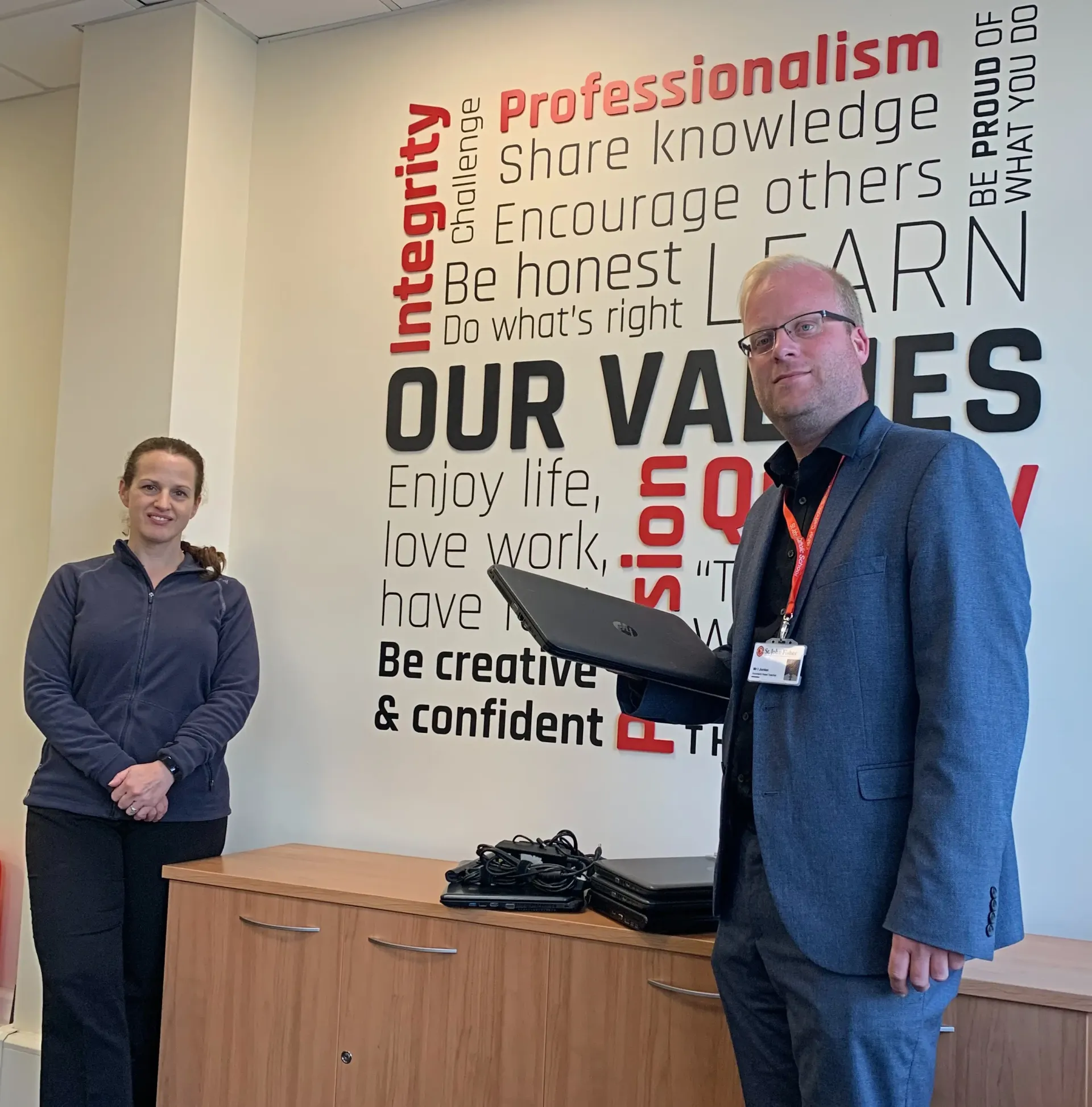 SafeLane's HR Manager Sharon Hemingway organised the donation of 5 laptops to St John Fisher's school to help learning and engagement.